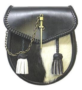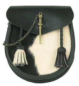 A Black leather sporran with Black and White bovine hair front and an easy to use pin lock fastener.(Straps and chains are included).